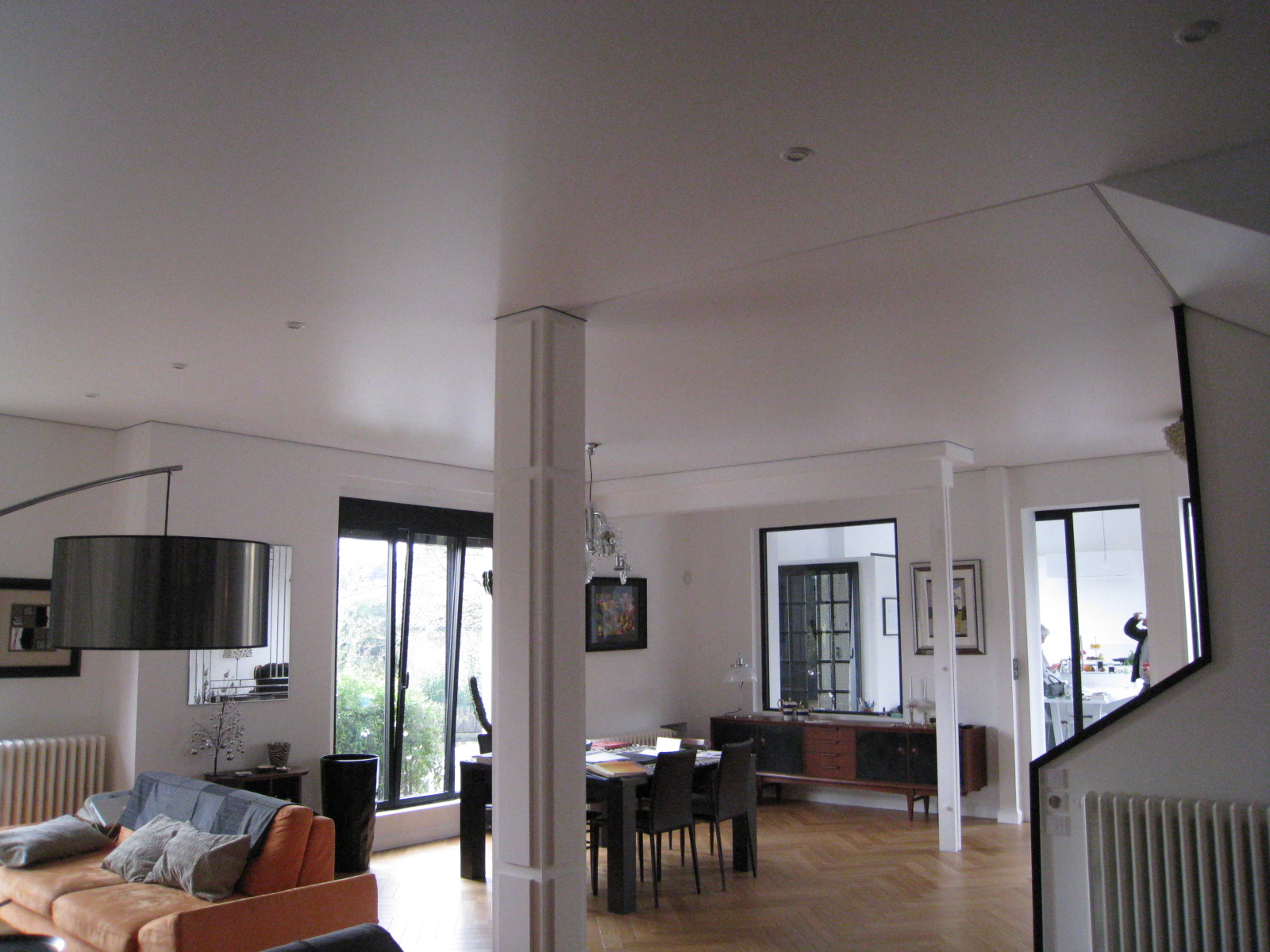 Aprés avoir supprimé la totalité des cloisons pour bénéficier d une piéce plus grande 60 m2, les clients ont opté pour un Plafond Tendu Extenzo afin d éviter le spectre des joints de plaque de plâtre dans ce volume traversant.